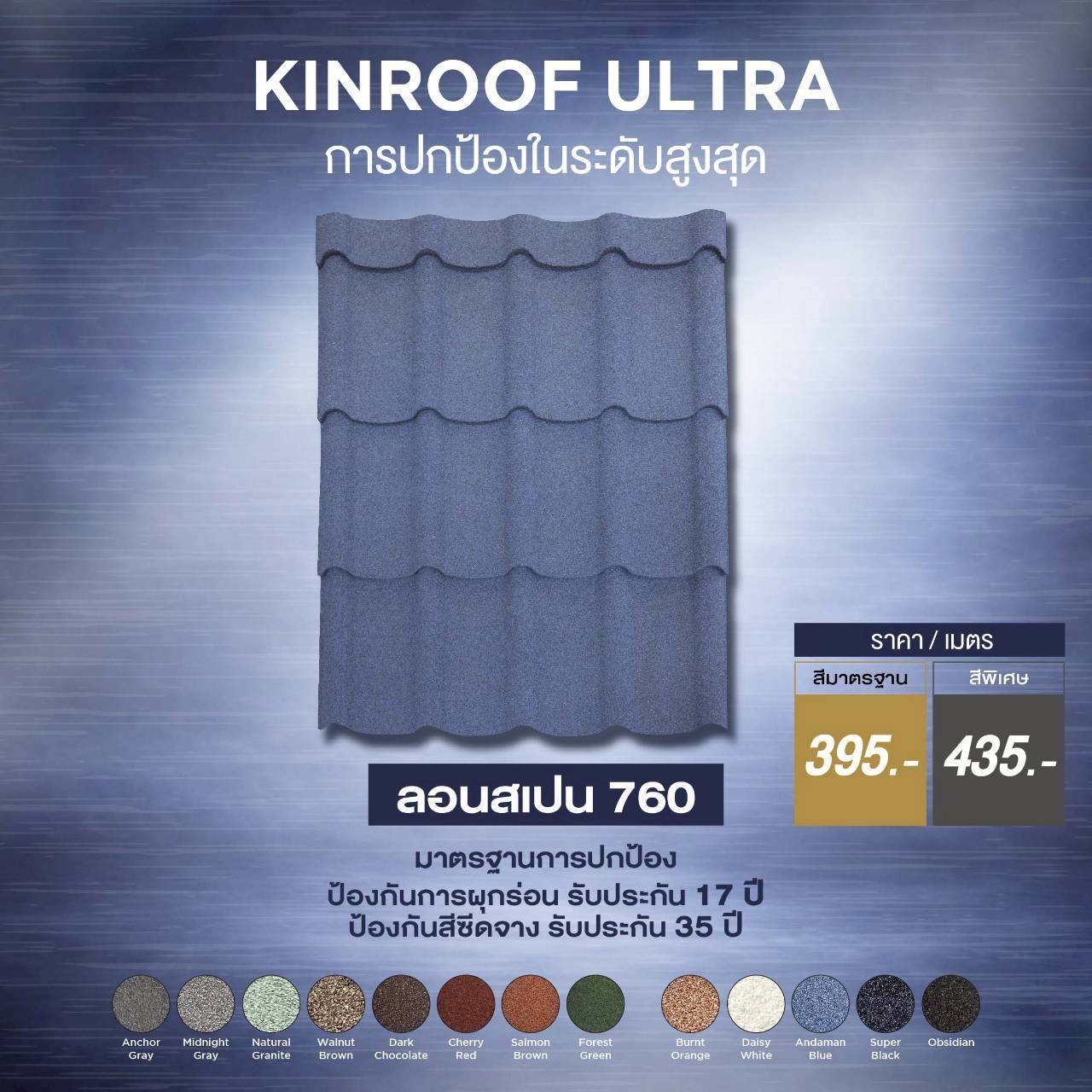 - หลังคา Kinroof มีอายุการใช้งานยาวนานกว่า 20 ปี ทนทานต่อทุกสภาพอากาศ ไม่ซีด ไม่รั่ว และยังมีการรับประกันคุณภาพ จึงมั่นใจได้ว่าลงทุนครั้งเดียว คุ้มค่าหลายสิบปี